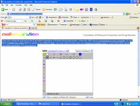 Draw your molecule and press the [Calculate Properties] or [Predict Bioactivity] button. When the JME input is not working on your computer, try our NEW WebME Ajax editor NEW or paste a raw SMILES here. You may wish to check also our Property Prediction FAQ or more information about calculated properties and drug likeness.