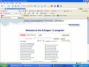 E-DRAGON is the electronic remote version of the well known software DRAGON, which is an application for the calculation of molecular descriptors developed by the Milano Chemometrics and QSAR Research Group of Prof. R. Todeschini. These descriptors can be used to evaluate molecular structure-activity or structure-property relationships, as well as for similarity analysis and highthroughput screening of molecule databases. DRAGON provides more than 1,600 molecular descriptors that are divided into 20 logical blocks. The user can calculate not only the simplest atom type, functional group and fragment counts, but also several topological and geometrical descriptors. The first release of DRAGON dates back to 1997. Updates and inclusions of new molecular descriptors are regularly made in order to advance research in QSAR.