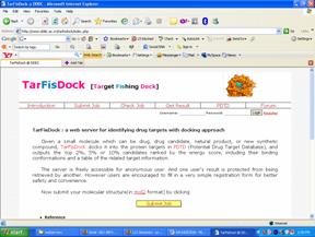 TarFisDock is a web server for identifying drug targets with docking approach. Given a small molecule which can be drug, drug candidate, natural product, or new synthetic compound, TarFisDock docks it into the protein targets in PDTD (Potential Drug Target Database), and outputs the top 2%, 5% or 10% candidates ranked by the energy score, including their binding conformations and a table of the related target information. The server is freely accessible for anonymous user. And one user's result is protected from being retrieved by another. However users are encouraged to fill in a very simple registration form for better safety and convenience. Now submit your molecular structure(in mol2 format) by clicking