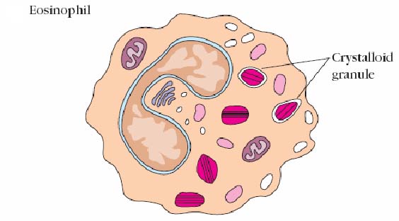 Eosinophils are granulocytes named because of their intense staining with 'eosin'. Eosinophils make up about 1-3% of leukocytes in circulation. They are similar in appearance to neutrophils except the nucleus is usually bilobed and their granules take up eosin. Under the microscope, eosinophils typically have a bilobed nucleus and contain many basic crystal granules in their cytoplasm. The granules are lysosomes in that they contain hydrolytic enzymes, peroxidase, and catalyze. Eosinophils may help limit the inflammation induced by basophils and mast cells in that they contain histaminase. About half of the material in the granules is major basic protein. They also contain aryl sulfatase. The latter two substances are toxic to parasitic worms (helminthes). Indeed, eosinophils appear to be the major host defense against these invaders. The granules are eosinophil mediators that are toxic to many organisms and also to tissues as in asthma. Eosinophils are motile and phagocytic and are particularly active in parasitic infection. In fact, blood work showing an increase in eosinophils is often caused by parastic diseases. As the parasites are very big to be phagocytosed, on appropriate stimulation, the eosinophils degranulate. Degranulation involves the fusion of the intracellular granules with the plasma membrane and the components are released to the outside of the cell, thereby killing the parasite. Since parasites aren't very common in Canada, eosinophilia may also be due to allergic disease like asthma, hay fever etc.