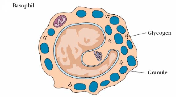 These two cells have similar functions, but must be considered distinct because of their different developmental histories. Basophils are found in circulation where they comprise about 0.2% of the leukocytes. They are rounded cells about 8-10 in diameter. They have an elongated nucleus usually with two constrictions which is sometimes folded into an S shape. Mast cells are often elongated. Those from connective tissues seem to be somewhat different from mucosal mast cells. For example, the latter require the presence of TH cells or their products for proliferation whereas connective tissue mast cells do not. Both mast cells and basophils contain large numbers of cytoplasmic granules that take up basic dyes. They are so numerous that they obscure other cell organelles. These granules contain large amounts of heparin and eosinophil chemotactic factor of anaphylaxis (ECF-A) and lesser amounts of histamine, serotonin, and precursors of prostaglandins and leukotrienes. Basophils and mast cells have receptors for both C3a and C5a and for the Fc piece of IgE. Binding of C3a and C5a or cross-linking of membrane bound IgE by allergens induces release 60% - 80% of the granules of both cell types. These factors cause contraction of endothelial cells and vasodilation of capillaries resulting in the redness, warmth and fluid accumulation in tissues characteristic of inflammation. Systemic release (basophils) can cause anaphylaxis. Release of ECF-A attracts eosinophils to the area which seems to be of particular importance in combating parasitic infestations. Mast cells are formed in the tissue from undifferentiated precursor cells released into the blood from the bone marrow. They are not the tissue counterparts of basophils but they have a similar importance in allergic reactions and are only found in tissues. There are two types of mast cells found either in the connective tissues or in mucosal sites. Both types contain numerous granules with preformed mediators which can be released from mast cells after stimulation. The preformed mediators include histamine and other pharmacologically active substances. Stimulation also results in the production of newly formed mediators by mast cells such as prostaglandins and leukotrienes. Stimulation of mast cells occurs in several ways such as by the anaphylatoxins (C3a, and C5a) of the complement system or by the crosslinking of surface IgE. Mast cells have high affinity Fc receptors for the IgE that is produced against an allergen. As a result, mast cell release is most significant in either acute inflammation or in allergic responses.