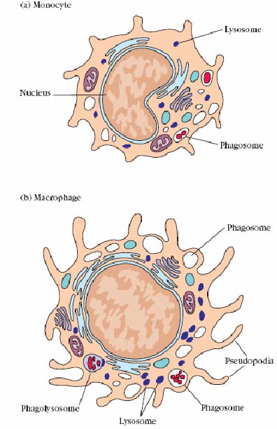 When monocytes enter the tissues and become macrophages they undergo several changes. The cells enlarge and increase the amount of intracellular lysosome allowing greater phagocytosis. In the tissues, macrophages live for months or years and may be motile. Macrophages move with amoeboid movements using pseudopods. Macrophages are usually in the resting state unless activated during an immune response. Activation of these cells may happen in response to TH derived cytokines (especially IFN gamma). Phagocytosis of antigens may also stimulate activation. Activated macrophages have an important role in phagocytosis. In this role they recognize and remove unwanted particulate matter including products of inflammation and invading organisms, antigens and toxins. Macrophages also have an important role in the presentation of antigens (as APC's) to T cells and in activating T cells with IL-1 release. Finally, macrophages have an important secretory role. After activation, these cells secrete interferons (for anti-viral activity), lysozyme and other factors that upregulate the inflammatory response. In chronic inflammation, macrophages act as scavengers and also become giant cells in the formation of granulomas. Fixed macrophages serve different functions in different tissues and are named to reflect their tissue location like alveolar macrophage in the lung, Histiocytes in connective tissues, Kupffer cells in liver, Mesangial cells in the kidney and Microgilial cells in the brain.