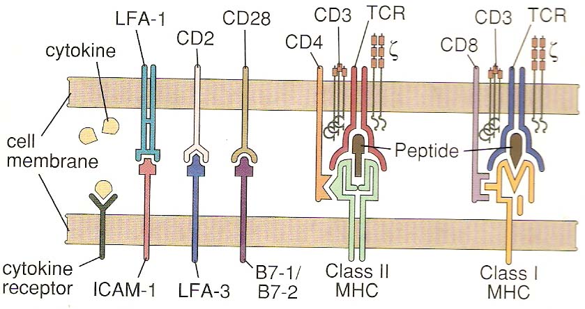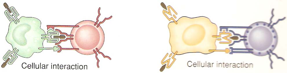 The generation of an immune response both humoral by B cells and cell-mediated by Tc cells (CD8+) depends on the activation of TH cells. The importance of these CD4+ cells has become obvious as these are the cells affected in AIDS (acquired immune deficiency syndrome). Mature B cells that have already seen antigen require contact with a T cell in order to become plasma cells or memory cells (T -B cell interaction). The T cells provide signals to the B cell through contact of the TCR complex and MHC-antigen, In addition, the activated T cell produces cytokines such as IL-2 and IL4, 5, 6 or IFN g which stimulate B cell proliferation and differentiation into antibody secreting B cells. The type of cytokines produced by the T cells helps the plasma cells to produce different classes of antibodies. So far it is unclear what causes this to happen, but we do know that there are two subtypes of TH cells namely TH1 and TH2 that produce different cytokines i.e. g IFN, TNF and IL 2 and IL 2,4,5,6 and 10 respectively and promote a different type of immune response. The two subsets look the same and have the same T cell markers and receptors. However, they secrete very different cytokines upon activation. In addition to other cytokines, the TH1 subset produces great amounts of IL-2 and IFN gamma; cytokines particularly important in cell mediated immunity. The TH2 subset is very good at providing B cell help by secreting IL-4,-5 and 6. Because the cytokines have different effects in an immune response, sometimes activation of one subset may be preferable to the other. For example, virus infection is best combated with interferon's anti-viral activity and cytotoxic T cells. This response is more likely to be stimulated by TH1 cytokines. The cytokines produced by the two subsets also have a cross-regulatory role. In other words, an activated TH2 cell secreting IL-4,-5, and 6 will down regulate the TH1 cells in the neighborhood. Likewise, TH1 released cytokines down regulate the TH2 responses.