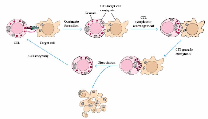 Immediately following the formation of the conjugate, granules in the CTL start to move through the cytoplasm towards the end of nearest the target cell. The CTL changes shape and becomes flattened towards the target allowing an area of contact between the two cells. Contents of the granules are released from the CTL by exocytosis and are responsible for initiated membrane damage to the target cell. The granules release cytokines, enzymes like granzymes and a molecule called perforin that is able to poke holes in the target cell membrane.