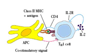 T cell activation is, in general, similar for both TH and TC cells but each are considered separately for clarity. TH cell activation is initiated by the interaction of TCR-CD3 complex with antigen-MHC class II molecules on the surface of an antigen presenting cell. This interaction initiates a cascade of biochemical events in the T cell that eventually results in growth and proliferation of the T cell. This occurs primarily through an increase in IL-2 secretion by the T cell and an increase in IL-2 receptors on the T cell surface. IL-2 is a potent T cell growth cytokine which, in T cell activation, acts in an autocrine fashion to promote the growth, proliferation and differentiation of the T cell recently stimulated by antigen. The T cell receptor is an antigen recognition molecule and therefore the T cell that best responds to the antigen presented is the one that gets turned on. Naive, bystander T cells have no IL-2 receptors and thus cannot be involved. The activation takes place through the T cell receptor complex and is aided by the CD4 molecule on TH cells and possibly other accessory molecules, such as CD45, CD28 and CD2. These molecules are accessory, but the APC also provides a co-stimulatory signal. The primary signal is the antigen-MHC II and TCR-CD3 interaction (and accessory molecules) while the co-stimulatory signal occurs with cytokines (IL-1 or IL-12). Activated TH cells then continue to become effector cells whose role includes B cell help and cytokine production.