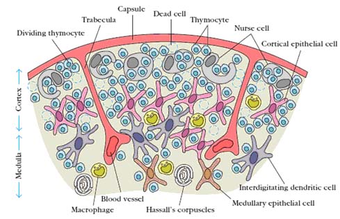 The thymus is the site of maturation of T cells. The thymus is a bilobed organ situated in the anterior mediastinum. The thymus develops from the third pharyngeal pouch. The parathyroid and major vessels in the upper thorax also develop from these pouches, so a defect in embryonic development can result is greater or lesser involvement of the parathyroid and major vessels. The thymus has two distinct lobes each of which consists of multiple lobules. The lobules have a cortex that is densely packed with rapidly dividing lymphocytes and a less dense medulla in which most of the cells are resting, mature T cells. The thymus is at its largest relative to body weight around the time of birth, but continues to grow in size until puberty. Thereafter it involutes, and the lymphoid elements are progressively replaced with fatty tissue, a process which continues throughout adulthood. PreT cells enter the thymus through the post-capillary venules located at the juncture of the cortex and medulla. The lymphocytes in the thymus called as thymocytes. Over the next several days, they migrate out into the cortex under the influence of some unknown chemotactic factor(s) then back through the cortex and into the medulla. During this time, they divide approximately every 12 hours. Under the influence of several thymic hormones, the best known of which are thymopoeitin and thymosin, they gradually acquire the membrane and functional characteristics of mature T cells. The mature T cells then leave the thymus through the postcapillary venules and enter circulation. Hassall’s corpuscles in medullary region composed of tightly packed whorls of epithelial cells that may be remnants of degenerating cell. Mouse without thymus usually referred as nude mouse because it suffers from severe infection. DiGeorge syndrome also suffers from T cell deficiency because of mutations in genes required for thymus development.