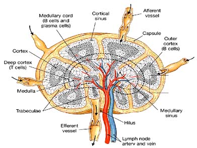 Lymph nodes are small nodular aggregates of lymphocyte rich tissue situated along lymphatic channels throughout the body. Lymph node consists of an outermost cortex and an inner medulla. The cortex is composed of an outer cortex of B cells organized into lymphoid follicles, and deep, or paracortical, areas made up mainly of T cells and dendritic cells. Beneath the subcapsular sinus, the outer cortex contains aggregates of cells called follicles. Some follicles contain central areas called germinal centers, which stain lightly with commonly used histologic stains. Follicles without germinal centers are called primary follicles and those with germinal centers are secondary follicles. When an immune response is underway, some of the follicles contain central areas of intense B-cell proliferation called germinal centers and are known as secondary lymphoid follicles. These reactions are very dramatic, but eventually die out as senescent germinal centers. Lymph draining from the extracellular spaces of the body carries antigens in phagocytic dendritic cells and macrophages from the tissues to the lymph node via the afferent lymphatics. Lymph leaves by the efferent lymphatic in the medulla. The medulla consists of strings of macro-phages and antibody-secreting plasma cells known as the medullary cords. Naive lymphocytes enter the node from the bloodstream through specialized postcapillary venules and leave with the lymph through the efferent lymphatic. Afferent lymphatic vessels drain fluid from the tissues and also carry antigen-bearing cells and antigens from infected tissues to the lymph nodes, where they are trapped. In the lymph nodes, B lymphocytes are localized in follicles, with T cells more diffusely distributed in surrounding paracortical areas, also referred to as T-cell zones. Some of the B-cell follicles include germinal centers, where B cells are undergoing intense proliferation after encountering their specific antigen and their cooperating T cells.