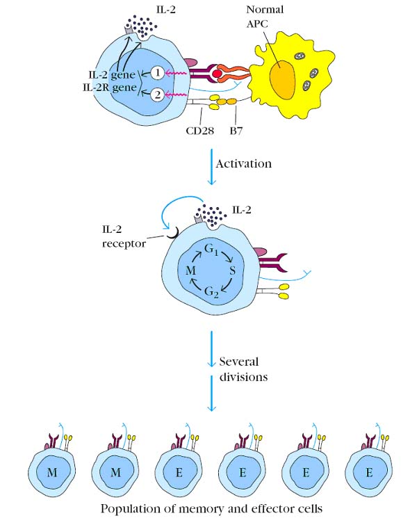 Since T cells are MHC restricted cells, they recognize antigen only through MHC Antigen complex i.e. they recognize only processed and presented antigen through APC cells. If a naive T cell recognizes an antigen-MHC complex on an appropriate antigen-presenting cell or target cell, it will be activated, initiating a primary response. About 48 hours after activation, the naive T cell enlarges into a blast cell and begins undergoing repeated rounds of cell division. Activation depends on a signal induced by engagement of the TCR complex and a co-stimulatory signal induced by the CD28-B7 interaction. These signals trigger entry of the T cell into the G1 phase of the cell cycle and, at the same time, induce transcription of the gene for IL-2 and the alpha chain of the high-affinity IL-2 receptor. In addition, the co-stimulatory signal increases the half-life of the IL-2 mRNA. The increase in IL-2 transcription, together with stabilization of the IL-2 mRNA, increases IL-2 production by 100-fold in the activated T cell. Secretion of IL-2 and its subsequent binding to the high-affinity IL-2 receptor induces the activated naive T cell to proliferate and differentiate. T cells activated in this way divide 23 times per day for 45 days, generating a large clone of progeny cells, which differentiate into memory or effector T-cell populations.
