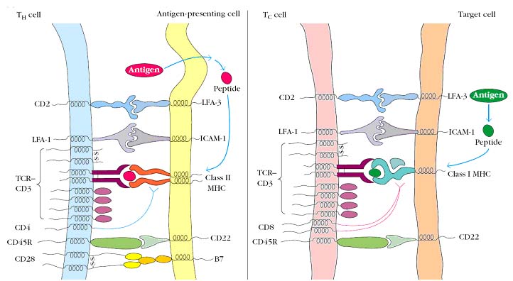 The various effector T cells carry out specialized functions such as cytokine secretion and B-cell help (activated CD4_ TH cells) and cytotoxic killing activity (CD8_ CTLs). Effector cells are derived from both naive and memory cells after antigen activation. Effector cells are short-lived cells, whose life spans range from a few days to a few weeks. The effector and naive populations express different cell-membrane molecules, which contribute to different recirculation patterns. Effector TH cells consists of subsets that produce distinct sets of cytokines and perform different functions such as TH1 and TH2 subsets. TC cells differentiate into functional CTLs, with the ability to kill target cells that express the peptide-MHC complexes these T cells recognize. The differentiation of T cell is associated with the transcriptional activation of genes encoding effector molecules. Some of these effector molecules, such as cytokines and CTL granule proteins, are released from the T cell, and others such as CD40 ligand (CD40L) and Fas ligand are cell surface molecules that are involved in effector functions.