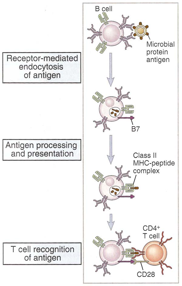 Antigen specific B lymphocytes bind the native antigen to membrane Ig molecules, internalize and process it in endosomal vesicles and present on their surfaces peptide fragments of the antigen complexed with class II MHC molecules. Antigen binding to membrane Ig enhances the expression of costimulators that increase the ability of the B lymphocytes to activate helper T cells. This occurs at the same time that antigen is being processed and presented by the B cell. The principal costimulators that are expressed on activated B cells are B7-2 and B7-1, both of which bind to CD28 on the T cell. Helper T cells can then recognize peptide-MHC complexes (signal 1) and costimulators (signal 2) and are stimulated to perform their effector function which is to promote B cell growth and differentiation. Thus the B cells themselves function as APCs in humoral immune responses to protein antigens. The peptide-MHC complexes can then be recognized by specific CD4+ helper T lymphocytes.