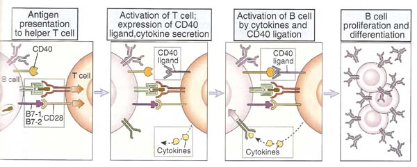 After antigen presented by B cell, T cells express CD40 ligand (CD40L) on its surface and release cytokines. CD40L is a T cell membrane protein that is structurally homologous to TNF and Fas ligand. CD40L interacts with CD40 on B cell when T cell and B cell binds. CD40L binding to CD40 results in oligomerization of CD40 molecules and this induces the association of cytoplasmic proteins called TNF receptor associated factors (TRAFs) to the cytoplasmic domain of CD40. The TRAFs recruited to CD40 initiate enzyme cascades that lead to the activation and nuclear translocation of transcription factors, including NF-kb and AP-1. Activated helper T cells were secret cytokines that act in concert with CD40L to stimulate B cell proliferation and production of antibodies of different isotypes.