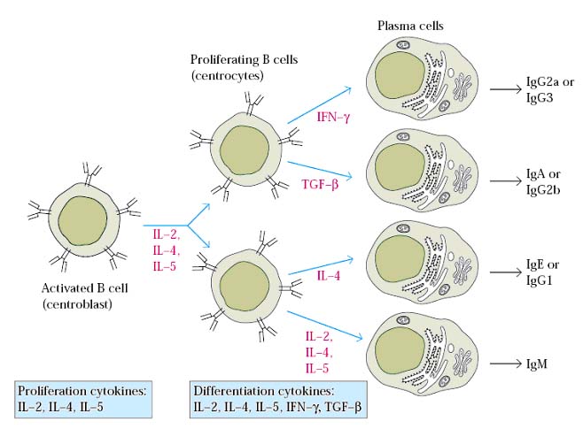 B-cell differentiation by cytokines: