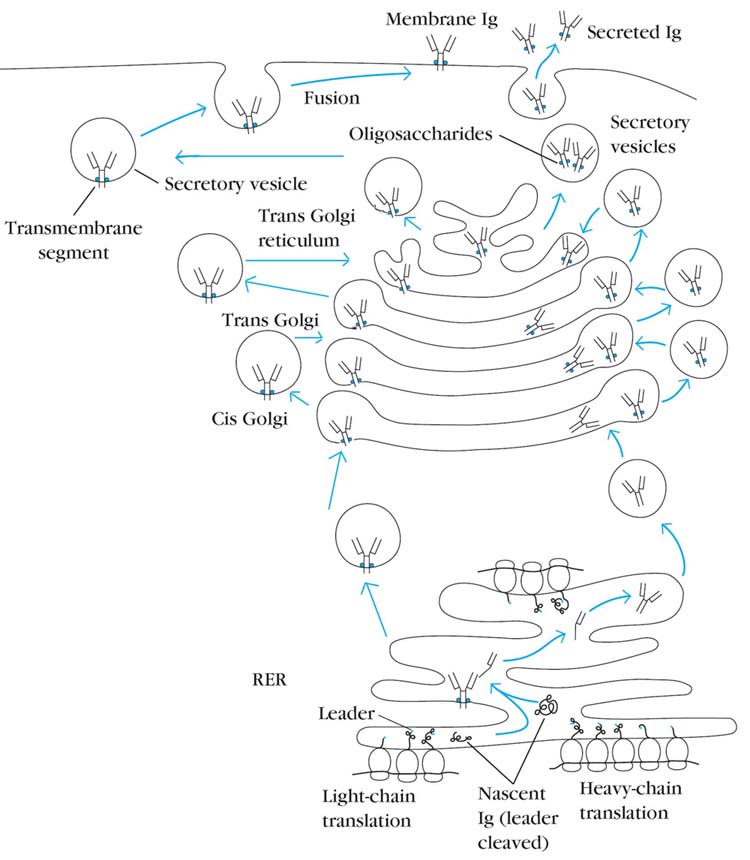 Immunoglobulin heavy- and light-chain mRNAs are translated on separate polyribosomes of the rough endoplasmic reticulum (RER). Newly synthesized chains contain an amino-terminal leader sequence, which serves to guide the chains into the lumen of the RER, where the signal sequence is then cleaved. The assembly of light (L) and heavy (H) chains into the disulfide-linked and glycosylated immunoglobulin molecule occurs as the chains pass through the cisternae of the RER. The complete molecules are transported to the Golgi apparatus and then into secretory vesicles, which fuse with the plasma membrane and antibody either present on membrane (BCR) or secreted out. The order of chain assembly varies among the immunoglobulin classes. In the case of IgM, the H and L chains assemble within the RER to form half-molecules, and then two half-molecules assemble to form the complete molecule. In the case of IgG, two H chains assemble, then an H2L intermediate is assembled, and finally the complete H2L2 molecule is formed. Interchain disulfide bonds are formed, and the polypeptides are glycosylated as they move through the Golgi apparatus. If the molecule contains the transmembrane sequence of the membrane form, it becomes anchored in the membrane of a secretory vesicle and is inserted into the plasma membrane as the vesicle fuses with the plasma membrane. If the molecule contains the hydrophilic sequence of secreted immunoglobulins, it is transported as a free molecule in a secretory vesicle and is released from the cell when the vesicle fuses with the plasma membrane.
